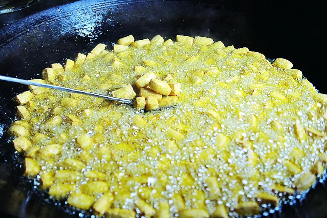 口袋豆腐的制作時(shí),先把做好的豆腐壓緊發(fā)酵, 然后切成小方塊放入油鍋,炸到皮呈金黃脆殼,用漏勺撈出放入土堿水中浸泡,而土堿水中浸泡環(huán)節(jié)則最為關(guān)鍵。