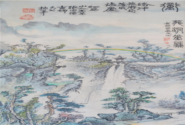 在城西疊水河。大盈江水從百尺斷崖飛流而下,景極壯觀,是騰沖頗負盛名的游覽勝地。李根源《太極橋記》云:“邑乘所稱:‘龍洞垂簾’,宜為吾郡第一名勝也?!?