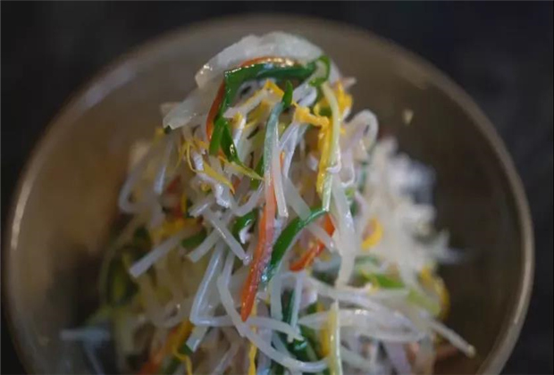 細(xì)串采用當(dāng)季的時蔬洋絲瓜、豆芽、韭菜搭配火腿、蛋片、里脊炒制。食材除豆芽、韭菜保留天然形狀外,其余都切成極細(xì)的絲狀。這三葷三素的搭配看似家常,實則精妙,熱油下鍋速炒幾秒便呈現(xiàn)出清脆、鮮香的口感,令人開胃。