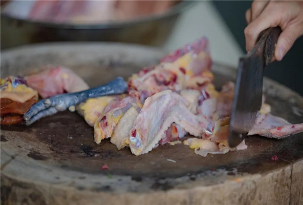 用老雞、老鴨、里脊肉切成大塊焯水去除血沫后,再加上以咸鮮聞名的云南宣威火腿放入砂鍋中加水熬制,文火熬煮整整6個小時后,湯色清亮如水,但滋味十分濃郁鮮美。在熬湯的過程中,干貨海參已經(jīng)用水發(fā)好切片,雞脯肉被捶打成泥放入模具上鍋蒸熟,時鮮冬筍切絲,這些食材被放入熬制好的高湯中,海參筋道彈韌,雞脯肉泥細(xì)膩綿密,包裹上湯汁鮮味十足。