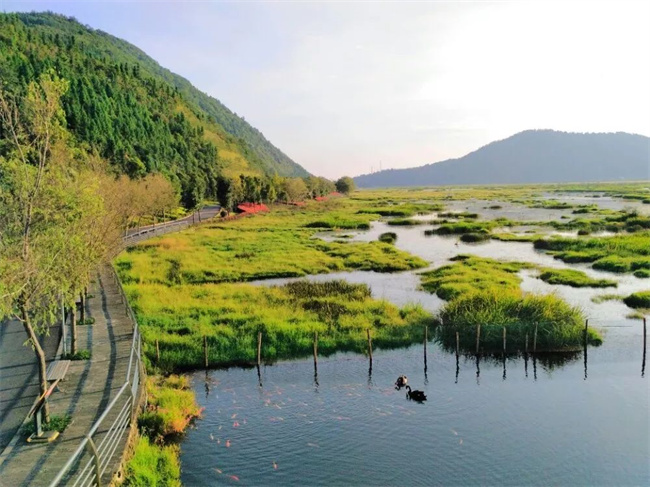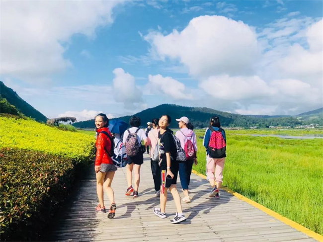看著草地是干涸的,實際上每一腳下去都會冒出水來,就像當初紅軍長征走過的草地一樣,稍不留意,也許踩上去就會陷入水中。徐霞客曾經(jīng)形象的描寫濕地的神奇:海子大可千畝,中皆蕪草青青,下如草浮結而成者,亦有溪流間流貫其間不能起。據(jù)說,這些水草不僅能分解水中和空氣中的雜質(zhì),還能調(diào)節(jié)氣候,保持生態(tài)平衡,對于現(xiàn)在日趨惡劣的環(huán)境來說,其作用不可估量,因此,既要保護濕地又要開發(fā)旅游是值得商榷的重要議題。目前,在保護濕地的基礎上,景區(qū)開發(fā)了許多新的項目,比如劃船、登山、民俗文化節(jié)等?,F(xiàn)在,無論是什么季節(jié)來到北海濕地,都會有不同的感受,春季,有大片紫色的鳶尾花;夏季,有白色的睡蓮;秋天,是紅色的金鳳花和紫色的水葫蘆;冬天,則是水鳥的樂園,這樣美妙的場景,的確是旅游、攝影的絕佳之地。