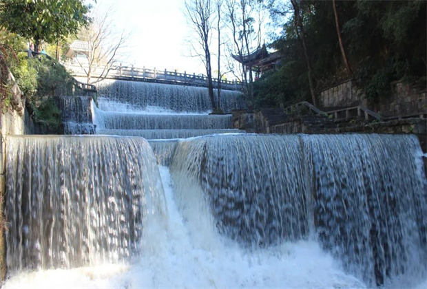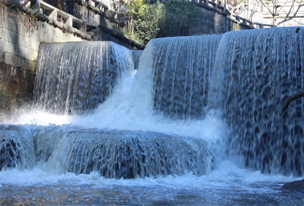 瀑布群由7級瀑布順階而下,氣勢磅礴,激流奔馳,破青崖,披白練,若銀河倒瀉,棉絮飄揚;玉漱飛鳴,如同牛毛細雨,飛灑周圍,常年不停。仙樂觀是“道觀”里面主要供放的是八仙中的呂純陽,始建于清光緒八年(公元1882年)。王母殿門前的對聯(lián)是老聯(lián)新做,取自八仙過海,把每個字進行分解得到:鐘離點石把扇搖,果老騎驢走趙橋,國舅手執(zhí)云楊板,湘子瑤池品玉簫;洞賓背劍清風(fēng)客,拐李提葫得道高,仙姑敬奉長生酒,彩和花籃獻蟠桃。