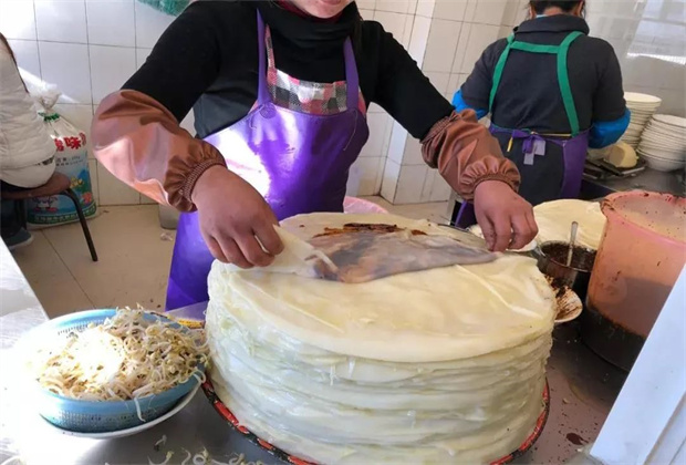 卷粉包入豆芽、醬汁、花生粉、辣椒油、芝麻油、花椒油等多種餡料,卷成圓筒食用,粉皮細膩滑爽,餡料多汁香脆,風(fēng)味獨特。也可切成條狀,以當(dāng)?shù)卮讻霭枋秤谩J秤弥笊钍芎迷u,是當(dāng)?shù)厝罕姴豢扇鄙俚娘L(fēng)味小吃。