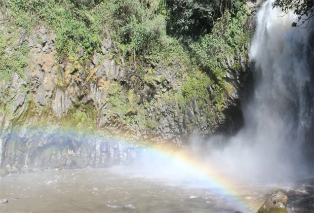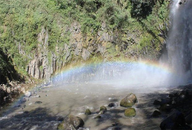 疊水河風(fēng)景區(qū)是騰越文化園的一個游覽片區(qū),是集自然景觀和人文景觀為一體的多元化國家AA級旅游風(fēng)景區(qū),是中國唯一的城市火山堰塞瀑布,在古騰越十二景中稱為“龍洞垂簾”。崖壁兩側(cè)上排列著奇妙的柱狀節(jié)理群,河水從左峽中奪路而出,飛濺之水霧飄潤崖谷、水汽蒸騰、珠沫四濺,如毛毛細雨、飛灑周圍,河水仿佛被疊為二折,故俗稱“疊水河瀑布”,形成了“不用弓彈花自散”的景觀。觀瀑臺可整體觀看瀑布,瀑布巖壁均有火山噴發(fā)后形成較為規(guī)則的柱狀節(jié)理。順著石階下到谷底便可近距離觀看瀑布,體驗驚濤洶涌。大盈江水從百尺斷崖飛流而下,形成銀河倒瀉,雪花飛落的景觀,聲若萬馬馳驟,雷霆轟鳴。每日下午兩點和三點左右,在陽光的照射下崖壁常常出現(xiàn)七色彩虹,更使飛瀑增添了異彩。太極橋位于瀑布飛瀉的崖頂,巨石蹲立,若龜似鱉,形態(tài)各異。距水口十步,有石橋橫臥江上,因橋下鎮(zhèn)有太極圖巨石得名。橋為三墩兩孔懸臂式平板石橋,中設(shè)石砌飛檐觀瀑亭,結(jié)構(gòu)堅實,樣式美觀。太極橋為紀念性建筑,既可為行人提供平安通道,又可為疊水飛瀑增添一景,具有很強的實用性和觀賞性,其工藝在地方建筑史上有重要的地位。疊水河西岸,有寺雄踞峰巔,蔚為大觀,名為龍光臺,所處之地為三峰的中峰。明嘉靖六年,知府嚴時泰到此觀瀑,見風(fēng)景壯美,于是令人伐木建亭,并題名“龍光”。嘉靖十年,郡人吳津有《龍光亭記》述其始末,讓其名得以傳世。萬歷年間又有愛國名將鄧子龍將其擴建,一時間名士詩人,題詠不絕。亭因瀑造,瀑以亭傳,名播四方,遠近皆聞。從太極橋前,沿中峰而上,過電站,至山門,可一覽其風(fēng)。大門正面為黎元洪題額“龍光臺”三字,楷書,兼有小識。