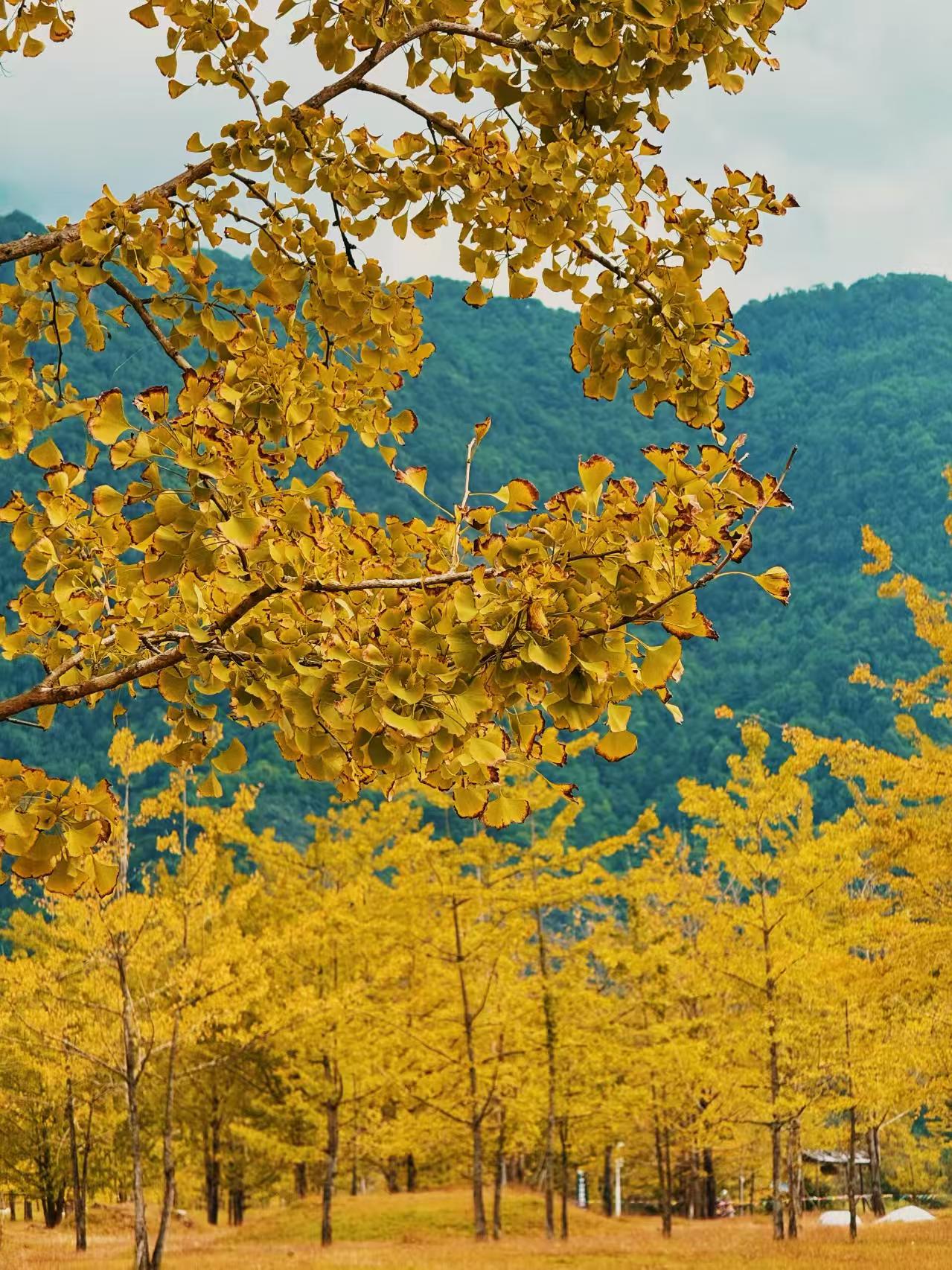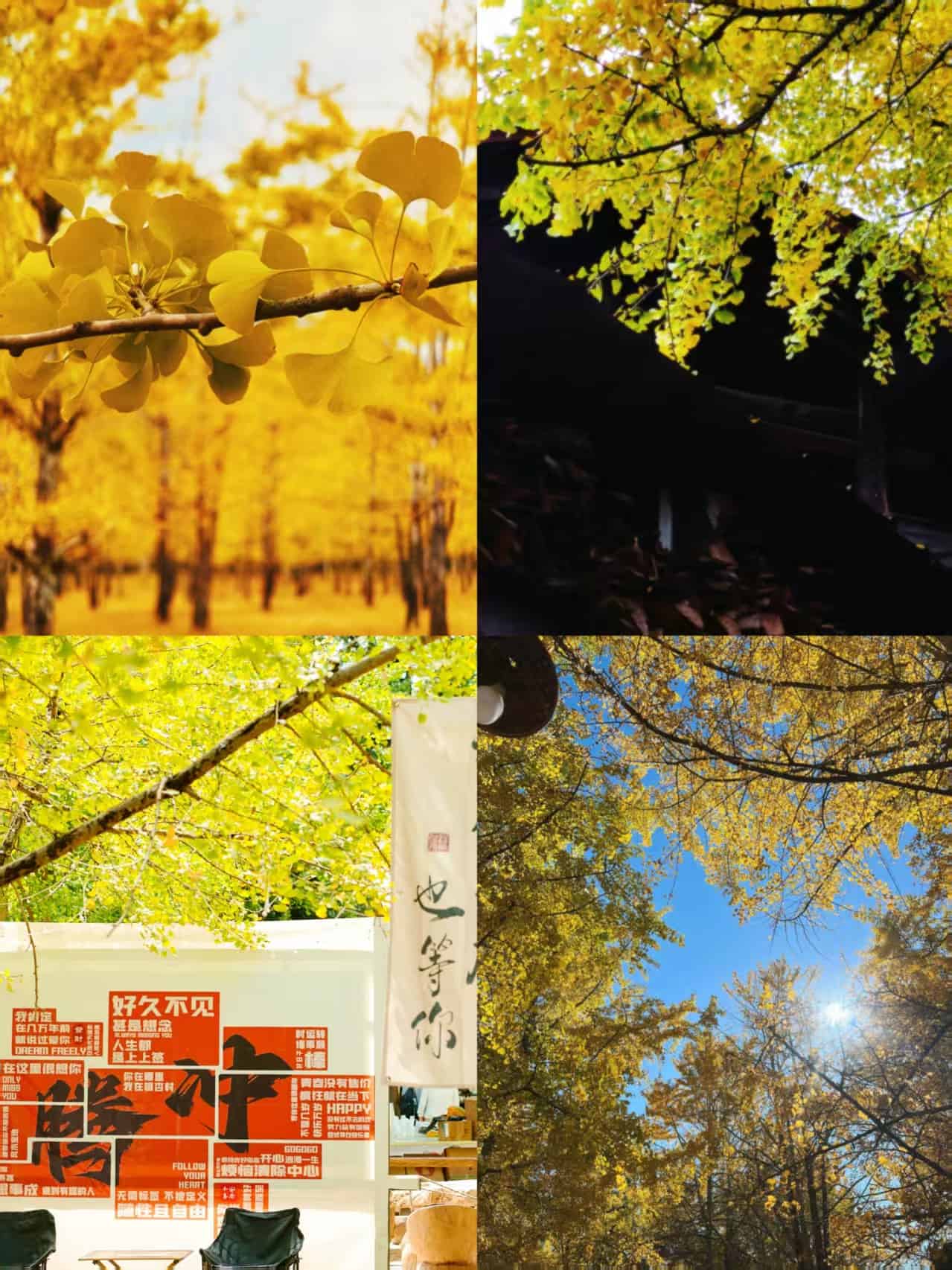 直奔銀杏王廣場,千年古樹在晨霧中如金色巨傘(穿淺色長裙+草編包,側(cè)逆光拍攝發(fā)絲光)。