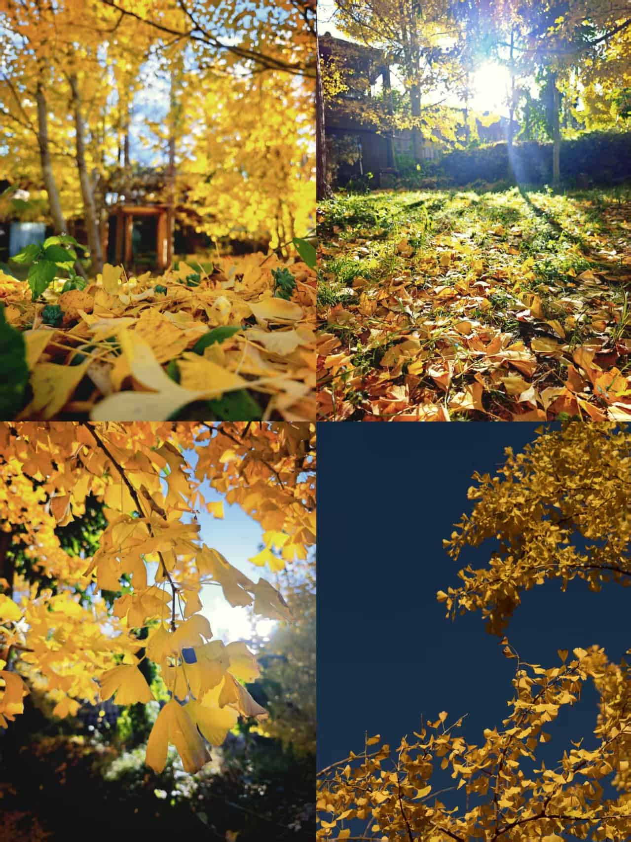 抓拍村民掃落葉的「金色雨簾」動態(tài)(用0.9倍廣角+連拍)。