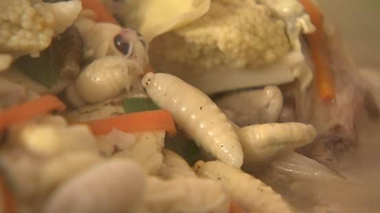 34、棕包,別名棕筍。是棕樹上長出的、未露頭開放的花穗。秋冬時節(jié)在棕樹上剝?nèi)ネ鈱幼仄ぜ纯扇〉?。棕包是騰沖美食中的上品食材,也是當?shù)乩圩迕朗场昂j懣铡钡闹匾鞑摹!昂j懣铡?因所選食材為“水里游著的,陸上長著的,天上飛著的”而得其美名。這道菜也把騰沖人靠山吃山、靠水吃水的生態(tài)飲食習(xí)俗發(fā)揮到了極致。這道菜把稻田魚的“泥土氣息”、粽包米的“微苦甘甜”和蜂蛹的“鮮香脆嫩”融為一體,堪稱“騰沖一絕”!