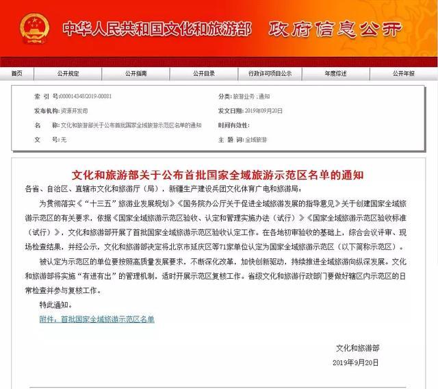通知指出,為貫徹落實《“十三五”旅游業(yè)發(fā)展規(guī)劃》《國務(wù)院辦公廳關(guān)于促進(jìn)全域旅游發(fā)展的指導(dǎo)意見》關(guān)于創(chuàng)建國家全域旅游示范區(qū)的有關(guān)要求,依據(jù)《國家全域旅游示范區(qū)驗收、認(rèn)定和管理實施辦法(試行)》《國家全域旅游示范區(qū)驗收標(biāo)準(zhǔn)(試行)》,文化和旅游部開展了首批國家全域旅游示范區(qū)驗收認(rèn)定工作。在各地初審驗收的基礎(chǔ)上,綜合會議評審、現(xiàn)場檢查結(jié)果,并經(jīng)公示,文化和旅游部決定將北京市延慶區(qū)等71家單位認(rèn)定為國家全域旅游示范區(qū)(以下簡稱示范區(qū))。