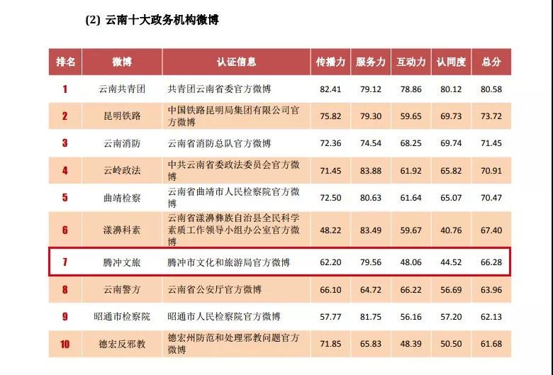 1月17日,人民日?qǐng)?bào)發(fā)布“2019年政務(wù)微博影響力排行榜”,對(duì)全國(guó)政務(wù)微博影響力進(jìn)行盤點(diǎn)。騰沖文旅官方微博(@騰沖文旅)在眾多政務(wù)微博中脫穎而出,榮獲云南省十大政務(wù)機(jī)構(gòu)微博第7名;云南省十大文旅系統(tǒng)微博第1名。