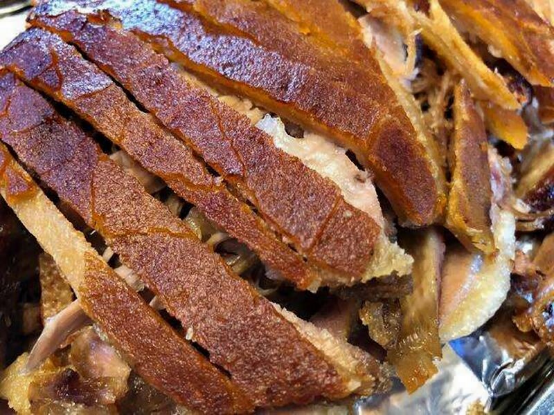 騰沖旅游不得不嘗的美食------烤乳豬,它有色澤呈亮,外酥里嫩,味道醇厚,肥而不膩的特點(diǎn)??救樨i選用在山里自由放養(yǎng)的小香豬制作,由于這個(gè)品種的豬耳朵特別小,在當(dāng)?shù)匾脖环Q為小耳朵豬。小香豬經(jīng)過(guò)炭火緩慢烤制,外皮呈現(xiàn)焦黃色,用刀切開時(shí)能聽到表皮酥裂的聲音。焦糖色的外皮包裹著鮮嫩的豬肉,再配上當(dāng)?shù)靥厣毫想绮烁?,令人垂涎三尺?