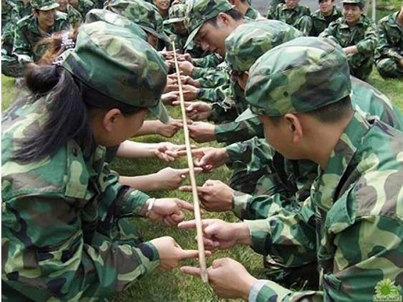 4、要求小組成員將齊眉棍保持水平,小組的任務是:在保證每個人的手都在齊眉棍下面的情況下,將齊眉棍完全水平的往下移動。一旦有人的手離開齊眉棍或齊眉棍沒有水平往下移動,任務就算失敗。
