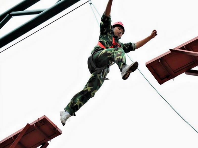學(xué)員站在板上,眼睛注視前方,起步、跨躍、落地。如果有人問你能否一步邁過1.1米的距離,你可能會(huì)覺得有些好笑,那有什么難的?但是,試想一下把這個(gè)距離放到8米高空,你腳下踩的是一塊只有0.3米寬、1米左右長的鋼板,要跨到另一塊同樣細(xì)長的鋼板上,兩者之間雖然只有1.1米,你能保證自己心里一點(diǎn)的也不打鼓嗎?高空斷橋就是通過讓你在高空邁過這艱難一步來進(jìn)行心理訓(xùn)練,它能令你勇氣倍增。