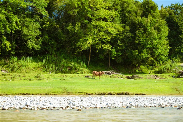 天空中盤旋的飛鳥,河水兩岸閑庭散步的牛群,田埂上的白鷺劃過水面,寧靜而悠長的河流,正是漂流的好地方,坐上一葉竹筏,任水流肆意的飄蕩,兩岸風光盡收眼底。