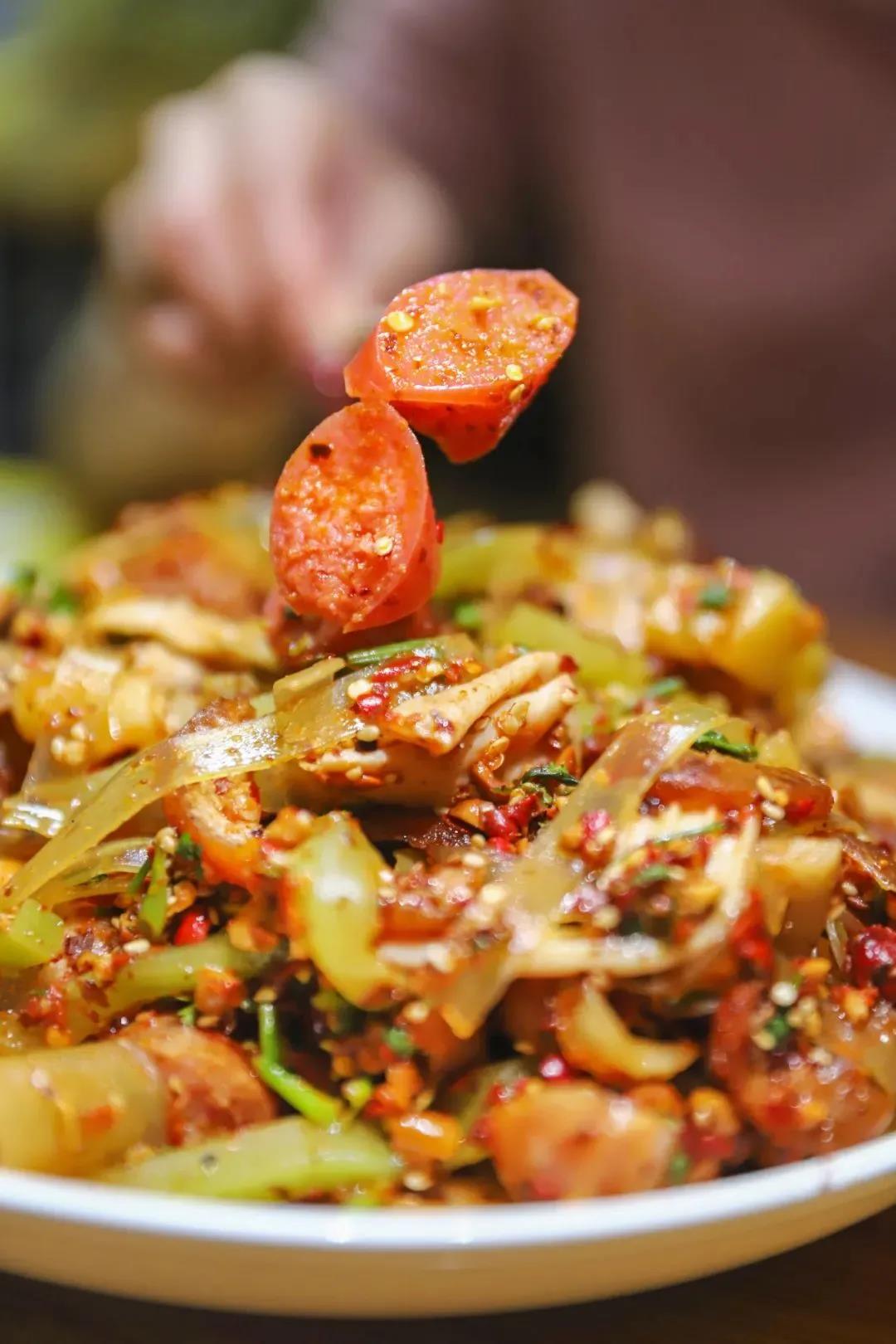 夏天,最缺不了的還是火燒肉。無(wú)論是拌豆粉、米線,還是萵筍絲、蘿卜絲、酸腌菜,加入火燒肉后,上好的油辣子一打,香醇的下村醋一灑!