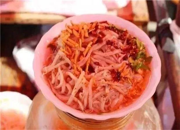 擦粉是用甜蕎面制成的涼粉,吃法多,調料也多,但必須用當地的梅子醋。騰沖擦粉雖好吃,但卻不開店專營,都是挑著小擔子沿街銷售。