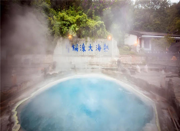 “大滾鍋”因泉沸水翻滾,騰煙蒸霧,氣勢(shì)恢宏,形似一口燒開水的巨鍋,被當(dāng)?shù)厝朔Q為 “大滾鍋”。300多年前徐霞客到此考察時(shí)對(duì)大滾鍋?zhàn)隽恕耙怀卮笏奈瀹€,中洼如釜,水貯于中,止及其半,其色渾白,從下沸騰。作滾涌之狀,而勢(shì)更厲?!钡拿枋?。60多年前李根源先生到熱海治病療養(yǎng)時(shí)也為此賦詩一首:“熱海翻波起怒潮,熊熊烈火地中燒,陰陽鼓動(dòng)皆春意,流注盈江潤(rùn)稼苗” 。